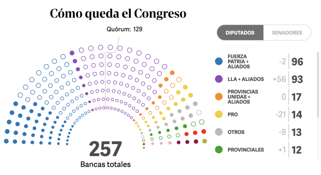 Le parti de Javier Milei s’est imposé au niveau national avec 40,8 % des voix, remportant 64 sièges à la Chambre des députés, sur les 127 qui étaient en jeu lors du scrutin. La coalition Fuerza Patria et d’autres forces appartenant au Parti justicialiste se sont classées en deuxième position, avec 34,7 % des voix, soit 31 des sièges en jeu.